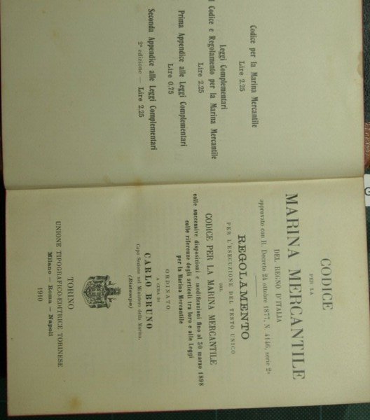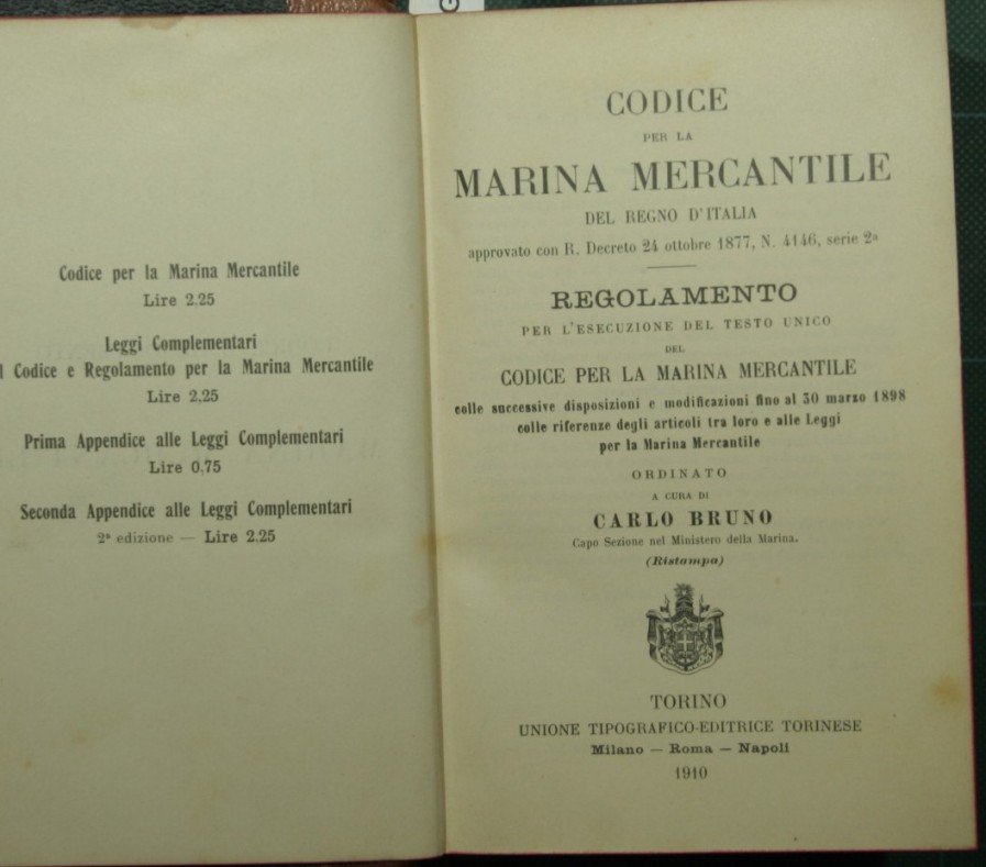 Codice per la Marina Mercantile del Regno d'Italia; Leggi complementari al Codice e al Regolamento per la Marina Mercantile coordinate fra loro e al testo del Codice e del Regolamento | Libri antichi e moderni | Bruno Carlo