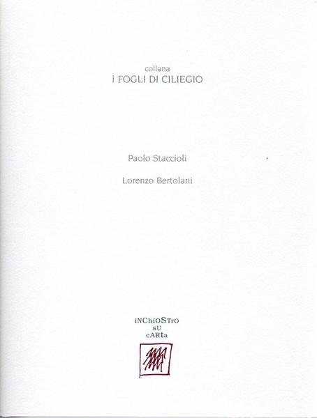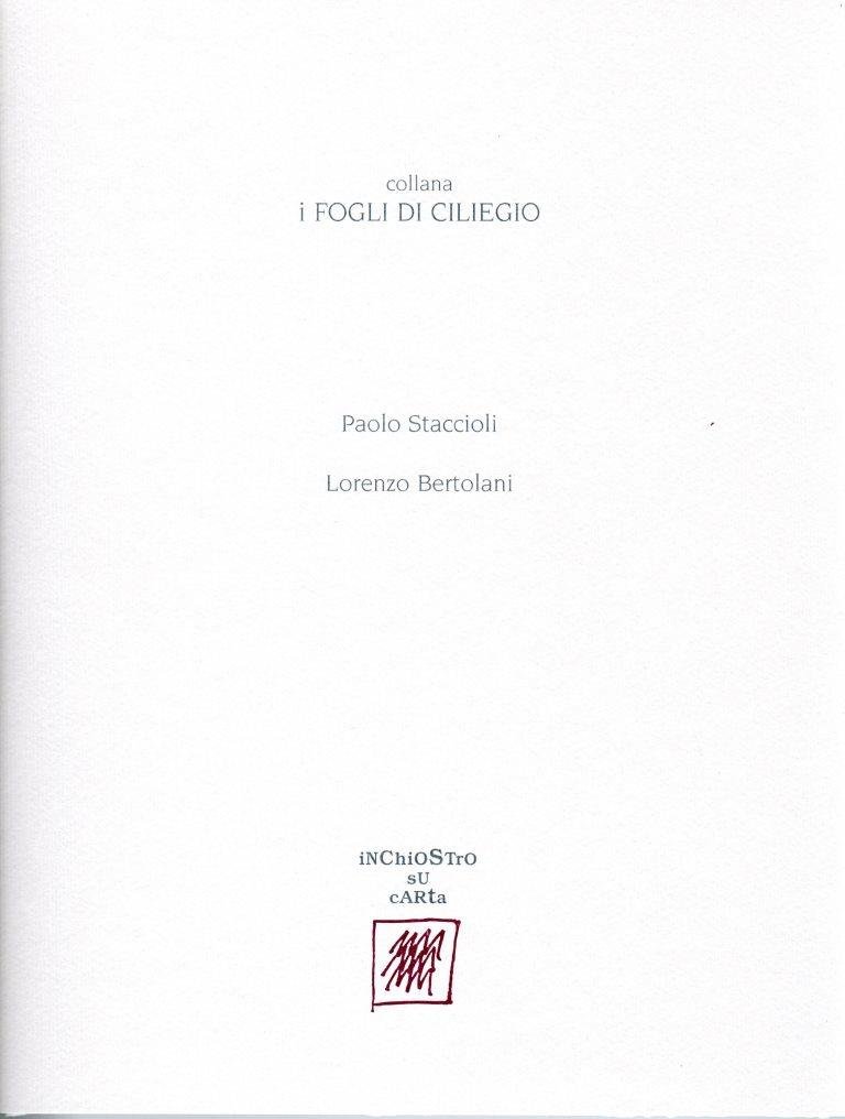 Collana i fogli di ciliegio, prima edizione marzo 2004, formato 19,5 x 25,5.<BR>Copertina morbida di colore grigio con titoli in nero al piatto anteriore.La cartella contiene una poesia di Lorenzo Bertolani e una tecnica mista di Poalo Staccioli, eseguita su carta Fabriano 300 gr.<BR>Ottime condizioni.