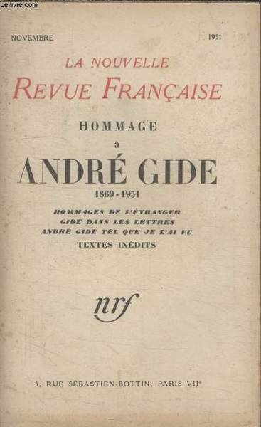 COLLECTION LA NOUVELLE REVUE FRANCAISE.HOMMAGE A ANDRE GIDE 1869 1951. HOMMAGE DE LETRANGER GIDE DANS LES LETTRES. ANDRE GIDE TEL QUE JE LAI VU. TEXTES INEDITS.