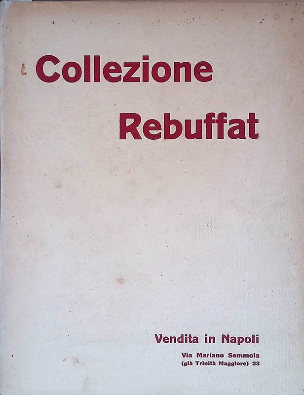 Catalogo della raccolta di dipinti antichi e moderni e di ceramiche antiche appartenente al Prof. Comm. Orazio Rebuffat, Esposizione e Asta, Napoli, Via Mariano Semmola 23; Esposizione: 15-17 maggio 1925; Asta: 18-25 maggio 1925. 64 p., f.to cm 28,5x22, copertina flessibile, XXVI tavole in b/n. Buone condizioni, dorso mancante, rinforzato con nastro.