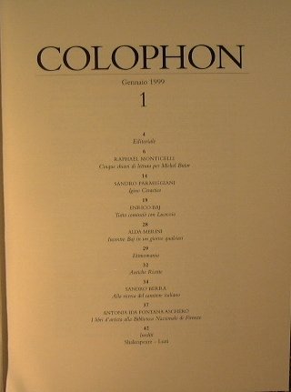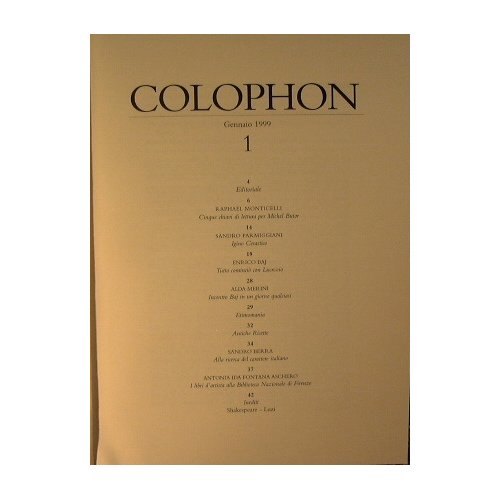 Quadrimestrale di libri d'artista e di bei libri - in 4° - pp.47 a rivista - Brossura editoriale - 9 volumi - Illustrazioni fuori testo in bianco nero. - Stato di nuovo - Numeri posseduti: Anno 1999 ( N.1 Gennaio. N.2 Maggio. N. 3 Settembre. ) Anno 2000 ( N.4 Gennaio. N.5 Giugno. N.6 Ottobre.) Anno 2001 ( N.7 Gennaio. N.8 Maggio . N.9 Settembre. ). Tra gli articoli: Cinque chiavidi lettura per Michel Butor. Tutto cominciò con Lucrezio. Etimomamia. Sindoni, epifanie del profondo. Il carattere. L'avventura dell'editoria d'arte. Lavori in corso. Il segno. Zucche e meloni. Il restauro del libro a Padova. Ecc.0