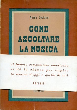 In-8°, pp. 176, (4), brossura editoriale a risvolti impressa a più colori. Numerosi esempi musicali n.t. Perfetto esemplare entro velina e con fascetta editoriale conservata. Prima edizione italiana di 'What to listen for in music', guida all'estetica e alle forme musicali, e all'ascolto della musica classica, scritta da uno dei massimi compositori americani del '900.