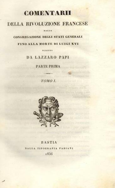 Opera completa in due parti, raccolte in nove volumi. Cm.22,3x13,5. Pg.792; 1948 complessive. Buone legature in mz.pelle con piatti marmorizzati. Titoli e fregi in oro ai dorsi. Fioriture. I primi tre volumi riguardano la prima parte e sono stampati a Bastia, i rimanenti sei concernono la seconda parte e sono impressi a Lucca. Il primo volume è preceduto da una "Notizia intorno alla vita e agli scritti di Lazzaro Papi" di A.Mazzarosa. Il Papi (Pontito di Pescia, 1763 - 1834) fu medico nelle Indie Orientali fino al 1802, poi Bibliotecario di Elisa Bonaparte a Lucca, quindi tenente colonnello delle truppe lucchesi. Nei "Commentari" formula un giudizio equilibrato, sostanzialmente favorevole, sulla rivoluzione. L'opera ricevette il gran premio letterario dell'Accademia della Crusca. > Brunet, IV, 351. Codice libreria 149647.
