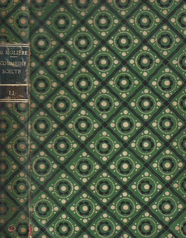 Opera incompleta delle commedie scelte di Moliere, secondo e ultimo volume che presenta: Il Tartuffo, L'avaro, Giorgio Dandin, Le dottoresse e L'ammalato immaginario, legatura artigianale datata, copertina rigida rivestita con carta decorativa, titoli incisi in oro inseriti in un tassello al dorso che mostra danni da parziale distacco, toni appesantiti, maggiormente in cornice, escoriazioni agli angoli, stato conservativo accettabile. Muffe sparse all'interno, il testo rimane pienamente godibile, pagine fine con tonalità uniformemente scurite da fattore tempo, fioritura ai tagli irregolari. N. pag. 337.