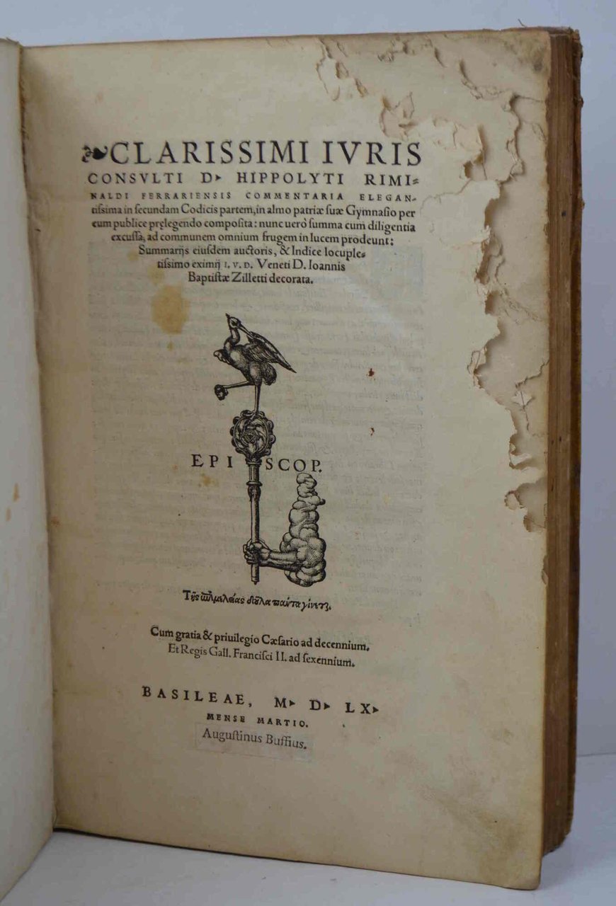 Cm. 34, pp. (8) 550 (62). Marchio tipografico al frontespizio ed al colophon. Legatura coeva in mezza pergamena, dorso a nervi con titoli manoscritti. Titoli elegantemente manoscritti al taglio basso. Esemplare peraltro genuino e ben conservato ma con una mancanza (di vari centimetri) all'angolo alto esterno delle prime 12 carte (senza mai toccare la parte incisa, se non per un paio di lettere.
