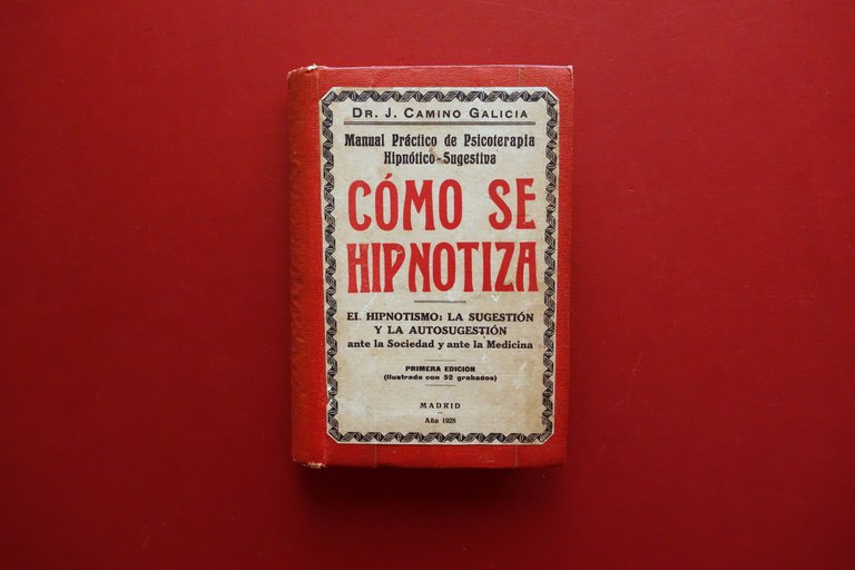 Dr. J. Camino Galicia, Como se Hipnotiza manual practico de psicoterapia hipnotico - sugestiva el hipnotismo, la sugestion y la autosugestion (sus derivaciones sociales y aplicaciones a la medicina) obra ilustrada con 52 grabados y 375 paginas Imprenta de Antonio Marzo, Madrid 1928; cm 17,5x11,5; pp. 375 con 52 fig. in b/n; legatura d'epoca in tutta tela con, ai piatti, applicati l'originale brossura ed. (al piatto post. la brossura ed. originale è stata notevolmente ridotta; vedi foto). Edizione in spagnolo. Condizioni di conservazione Buone condizioni con tracce d'uso, coperta con qualche minuscolo strappetto alle cuffie e agli angoli dei piatti, brossura originale con alcuni leggeri aloni e minime bruniture. Interni buoni con minimo foxing e lievi marginali accenni di ingiallimento dovuti al tipo di carta; margini rifilati un poco maldestramente in fase di rilegatura. Pagine 368-369 con lieve fessurazione, esemplare saldo e compatto. Prima edizione. Edizione in spagnolo. SETT27.L26837 N
