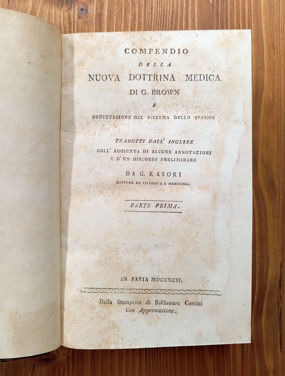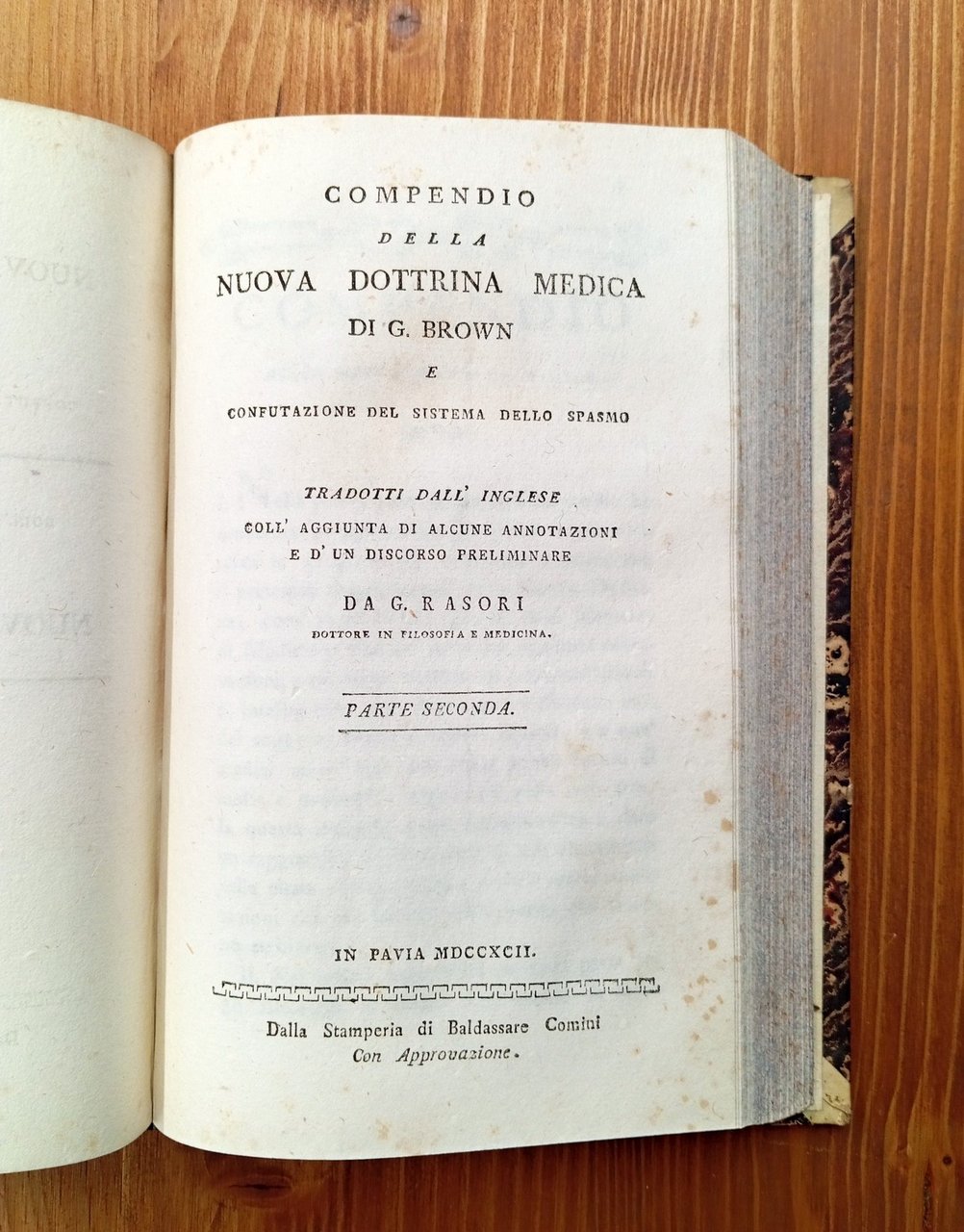 Compendio della nuova dottrina medica di G. Brown e confutazione del sistema dello spasmo tradotti dall'inglese coll'aggiunta di alcune annotazioni e d'un discorso preliminare da G. Rasori dottore in filosofia e medicina - Parte prima e seconda | Libri antichi e moderni | Brown, John