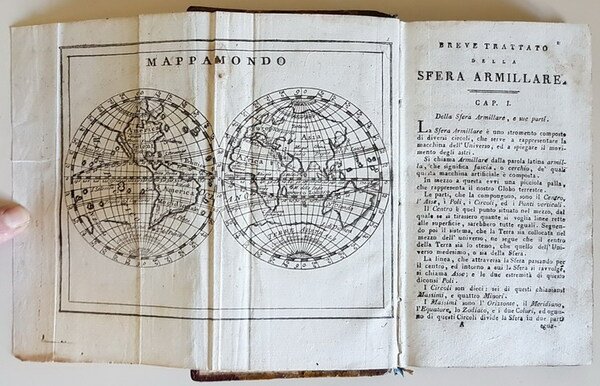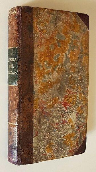 Vol. in -16 (10,5 x 18 cm.), legaura coeva m.pelle con angoli marrone, piatti marmorizzati in toni di beige, titoli in oro entroriquadro in pelle verde al dorso, tagli dei fogli spruzzati rossi e verdi, pp. VIII, 352, 1 cartina incisa con Mappamondo più volte ripiegata all'inizio del volume. Legatura montata al contrario (alto in basso) per il resto in buone condizioni.
