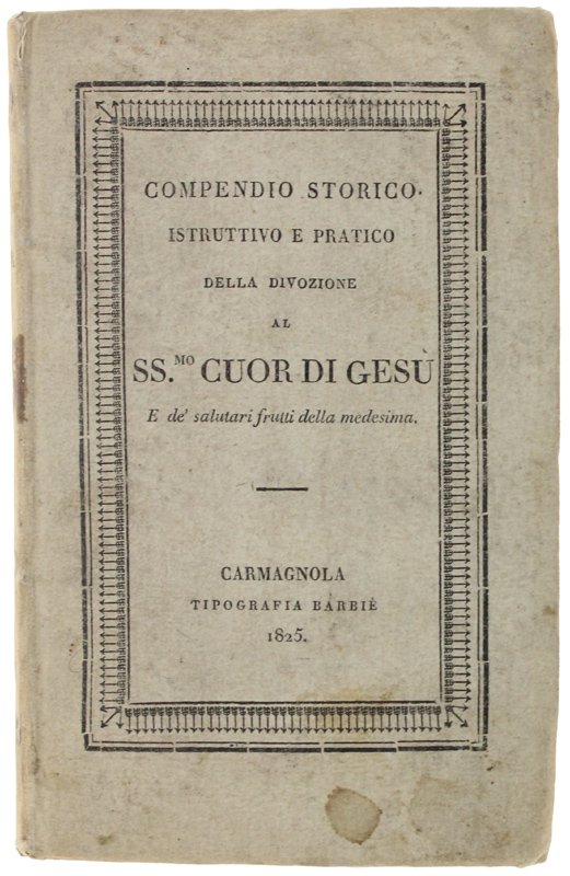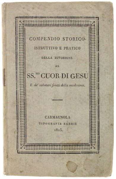COMPENDIO STORICO ISTRUTTIVO E PRATICO DELLA DIVOZIONE AL SS.MO CUOR DI GESU' E de' salutari frutti della medesima. Edizione prima piemontese. Coll'aggiunta delle orazioni che si recitano nella chiesa parrocchiale di S. Maria di Piazza in Torino.