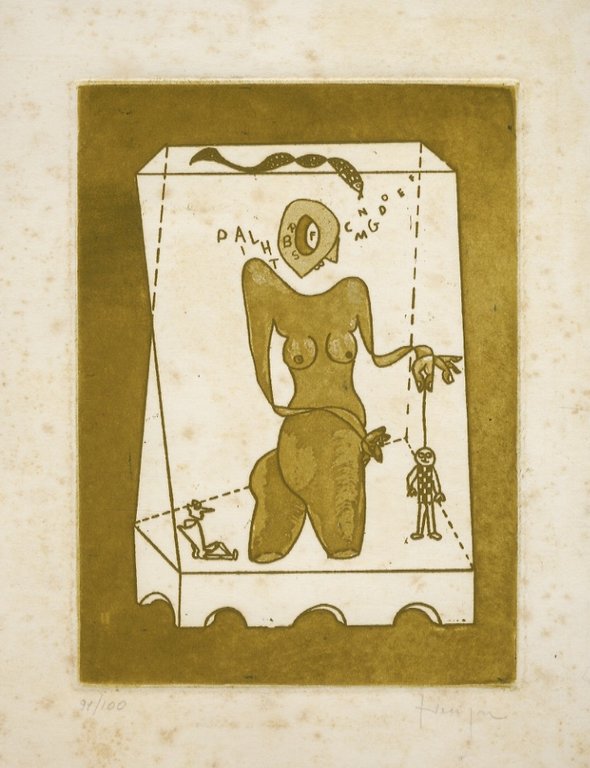 [Composizione di fantasia con busto femminile e marionette]. | Libri antichi e moderni | Vaccarone Francesco (4 Ottobre 1940 - 22 Aprile 2024).
