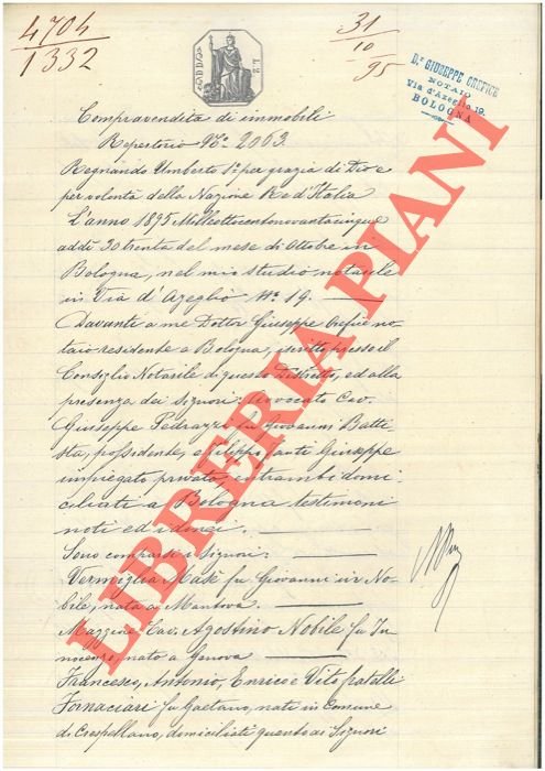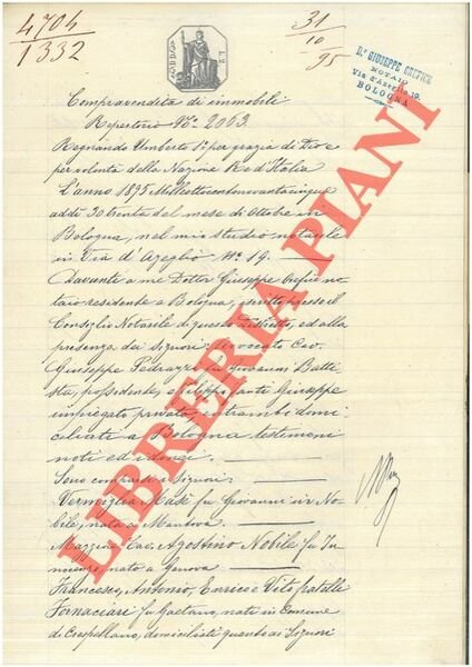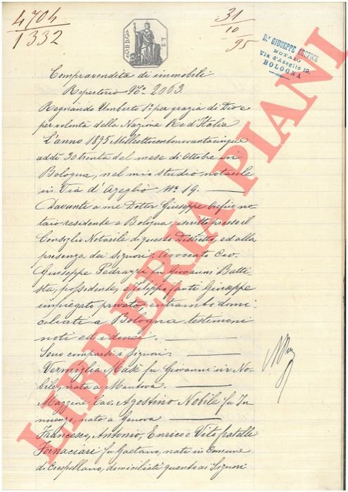 Bologna, 1895, ottobre 30, rogito originale di 8 pagine, con mappe catastali, timbro a secco, firma del notaio Giuseppe Orefice di Bologna