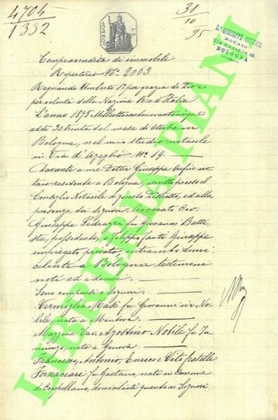 Bologna, 1895, ottobre 30, rogito originale di 8 pagine, con mappe catastali, timbro a secco, firma del notaio Giuseppe Orefice di Bologna