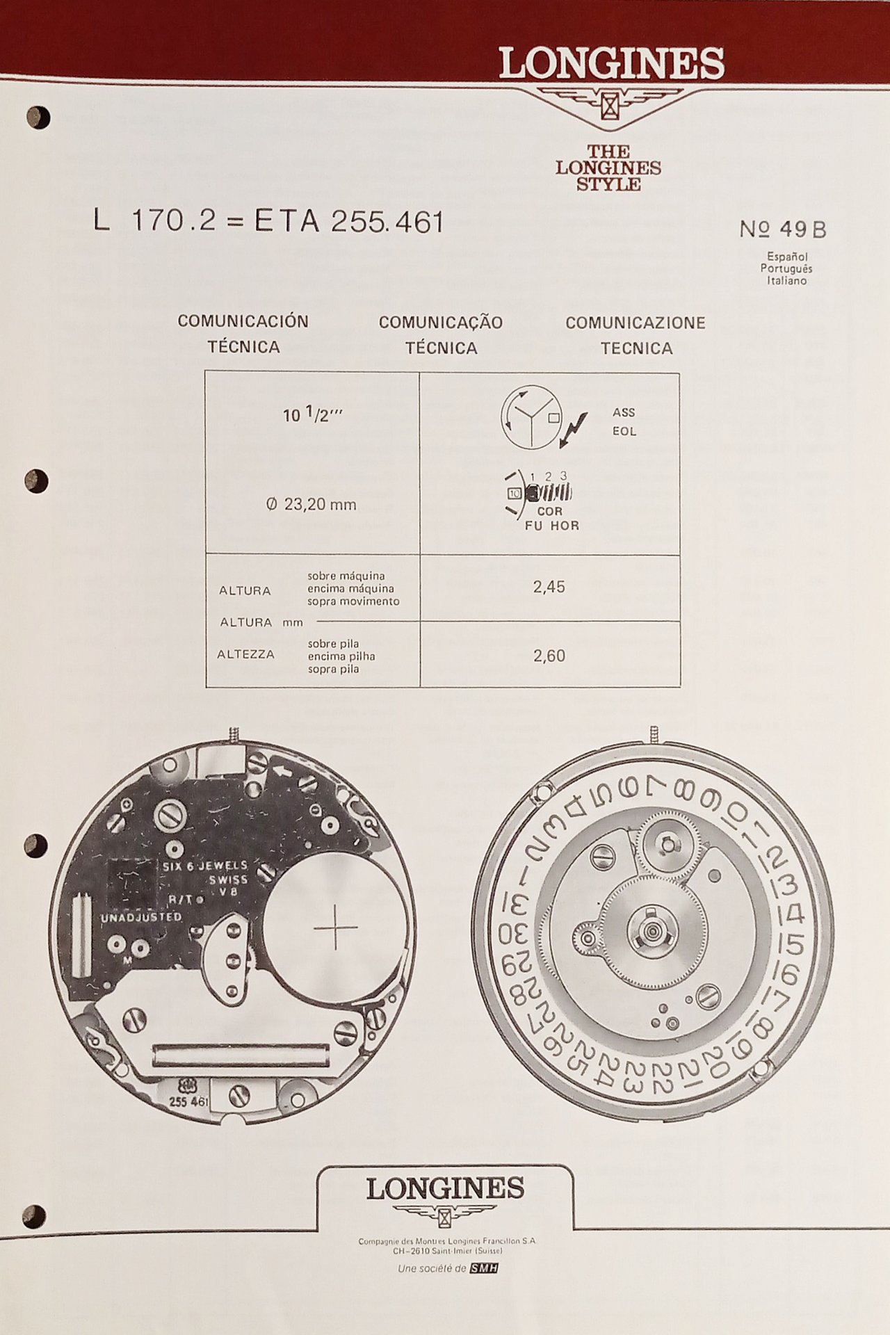 Comunicazione Tecnica Longines N. 49 B - L 170.2 = ETA 255.461 - ed. 1988