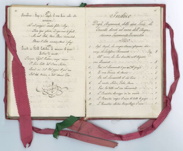 Eigenh. Manuskript mit U. (1) Bl., 95 (recte: 96) SS. In weinrotem Seideneinband mit Bindebändern und Lesenbändchen. Gr.-8vo. Kalligraphisch ansprechend gestaltetes Widmungsmanuskript mit geistlichen Betrachtungen in Versen zur Eucharistie, gewidmet der Kaiserin Karoline Augusta. Im Folgejahr in ausführlicherer Form publiziert als "Concetti devoti in onore dell'eucaristia" (Venedig: Giuseppe Gattei, 1833), dürfte die vorliegende Handschrift als dekorativ ausgeführtes und gebundenes Unikat jedoch Präsentationszwecken gedient haben. Das Widmungsvorwort von Predonzani in seiner gewöhnlichen Handschrift unterschrieben. - Vorderer Seidenspiegel gelockert, insgesamt jedoch hübsch und wohlerhalten.