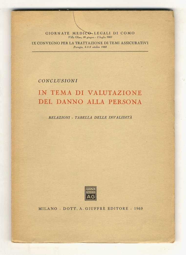 CONCLUSIONI in tema di valutazione del danno alla persona. Relazioni - Tabella delle invalidità. IX Convegno per la Trattazione di Temi Assicurativi. Perugia, 4-6 ottobre 1968. | Libri antichi e moderni |