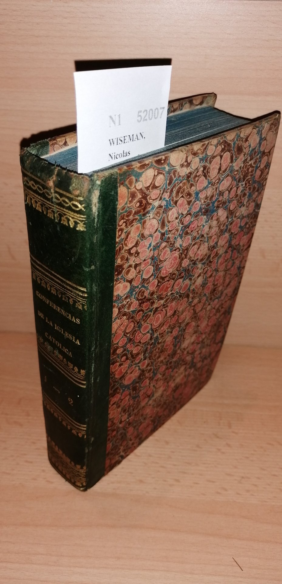 WISEMAN, Nicolas CONFERENCIAS SOBRE LAS DOCTRINAS Y PRÁCTICAS MAS IMPORTANTES DE LA IGLESIA CATÓLICA TENIDAS EN LA IGLESIA DE S. MARY´S MOORFIELDS Por el Ilmo. Sr. --- . Precedidas de una introducción acerca del estado actual del protestantismo (2 TOMOS ENC. EN UN VOLUMEN) El Católico. Madrid. 1851 2 tomos en 1 vol. 24 cm Enc. holandesa, con dorados. Cortes coloreados. Sello de anterior propietario. N1 (Ref.52007) religion espiritualidad iglesia catolica londres inglaterra
