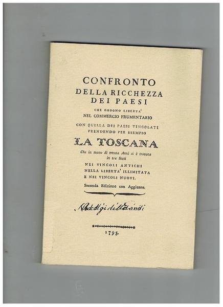 Confronto della ricchezza dei paesi che godono libertà nel commercio frumentario, con quella dei paesi vincolati prendendo come esempio la Toscana, che in meno di 30 anni si è trovata in tre stati, nei vincoli antichi, nella liberà illuminata e nei vincoli nuovi. Ristampa anastataica della seconda edizione del 1795.