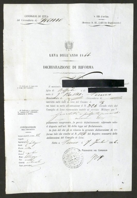 Consiglio di Leva dell'Anno 1866 Circondario di Fermo - Dichiarazione di Riforma