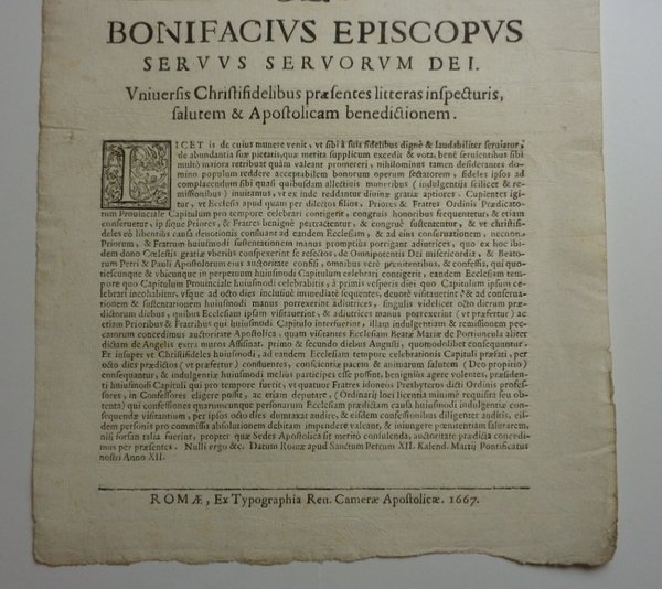 In folio (39 cm), in barbe; grande stemma papale di Alessandro VII tra i santi Pietro e Paolo. E' la Costituzione con la quale si concede l'indulgenza ai visitatori della Porziuncola. Ma il testo e la formula, dal 1400, vennero impiegate per innumerevoli altre indicazioni di indulgenze particolari per chiese, monasteri e luoghi di culto lungo tre secoli. Bell'esemplare,
