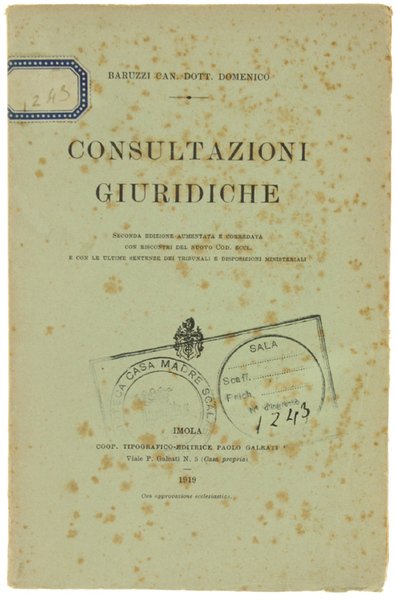 CONSULTAZIONI GIURIDICHE. Seconda edizione, aumentata e corredata con riscontri del nuovo codice ecclesiastico e con le ultime sentenze dei tribunali e disposizioni ministeriali. | Libri antichi e moderni | Baruzzi Domenico.