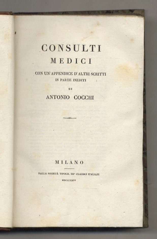 Milano, Società Tipografica de' Classici Italiani, 1824, bella legatura coeva in mezza pelle marrone con titolo e ricchi fregi oro al dorso, piatti in carta marmorizzata, pp. XIII, (1), 624. Vol. III delle "Opere" in cui sono raccolti vari consulti medici dati anche a sovrani ed alte personalità europee dal celebre medico Cocchi, umanista e docente universitario a Firenze. Esemplare a larghi margini, in ottime condizioni.