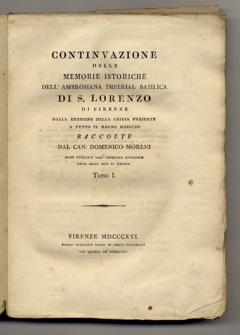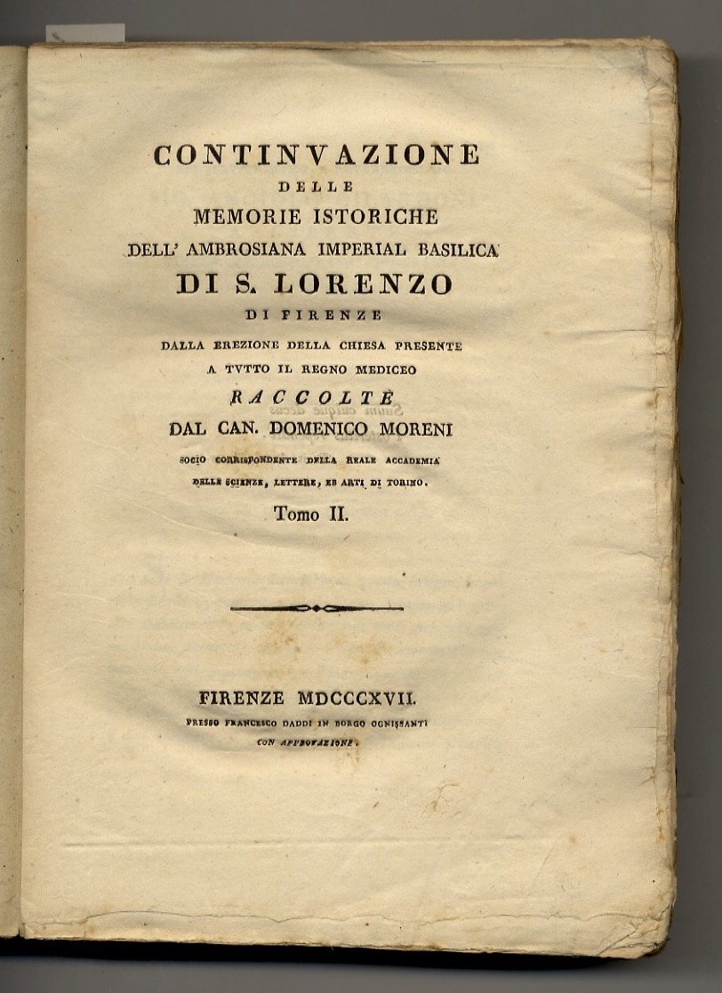 Continuazione delle Memorie istoriche dell'Ambrosiana imperial Basilica di S. Lorenzo di Firenze dalla erezione della chiesa presente a tutto il regno mediceo raccolte dal can. Domenico Moreni [.] tomo I.[- tomo II]. | Libri antichi e moderni | Moreni Domenico.