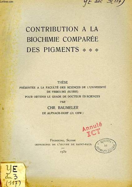 CONTRIBUTION A LA BIOCHIMIE COMPAREE DES PIGMENTS (THESE) | Libri antichi e moderni | Baumeler Chr.