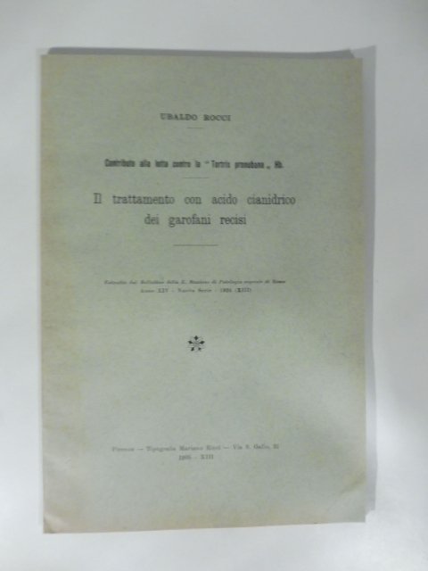 Contributo alla lotta contro la Tortrix pronubana Hb. Il trattamento con acido cianidrico dei garofani recisi | Libri antichi e moderni | Rocci Ubaldo
