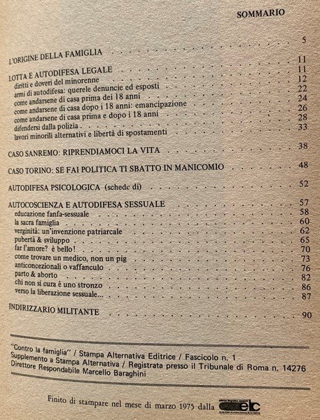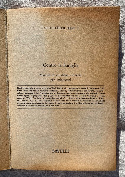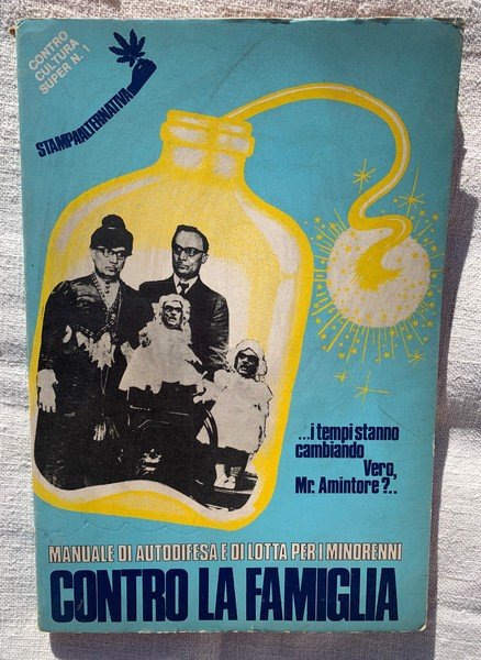 AA.VV. Contro la famiglia. Manuale di autodifesa e di lotta per minorenni. Roma, Stampa Alternativa Editrice-Savelli-ELC (Editrice Litografica Casalotti) 1975 italian, in ottavo 98 I ed.: marzo 1975. Supplemento a Stampa Alternativa (Direttore Responsabile: Marcello Baraghini) "Controcultura super", n. 1. "(.) manuale fatto da CENTINAIA di compagni/e e fratelli "minorenni" di tutta Italia che hanno mandato materiali, notizie, testimonianze e solidarietà (.)". VIII piccolo/ 98/ brossura patinata con grafica in azzurro cielo/blu/b/n/giallo ed illustrata ai piatti (primo piatto: fotomontaggio umoristico con ritratto di famiglia con facce di Amintore Fanfani entro bomba Molotov in giallo/b (.i tempi stanno cambiando / Vero, / Mr. Amintore?.) - ultimo piatto: vignette in nero su fondo azzurro cielo). Illustrazioni in nero nel testo, copertina illustrata a coll. Stato buono-discreto (stato d'uso della copertina, mancano le pp. 1-2 prob. vuote, carta delle pagine ingiallita). "Temi (dal sommario): "L'origine della famiglia", "Lotta e autodifesa legale" (in parte a cura dei compagni del Controcultura di Sanremo), "Caso Sanremo: riprendiamoci la vita" (i compagni del Controcultura di Sanremo hanno preparato 300 pagine di documentazione per il capitolo), "Caso Torino: se fai politica ti sbattono in manicomio" (a cura dei compagni di "Terra" e della "Cooperativa elettrika"), "Autodifesa psicologica" (schede di), "Autocoscienza e autodifesa sessuale", "Indirizzario militante".
