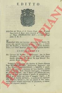 Roma, 1750, 1° luglio, Editto di cm. 17 x 26, pp. 6 con stemma xil. pontificio a firma Card. Valenti.