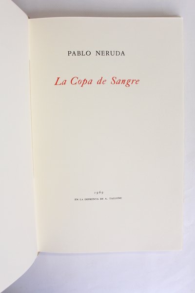In-4° (8,5x29cm), pp. 98, brossura editoriale incamiciata. Camicia e custodia in cartone. Ex libris. Stato di nuovo. Tiratura di 507 esemplari numerati (n. 28 su carta Miliani di Fabriano). Edizione composta a mano con caratteri Tallone incisi su punzoni da Charles Malin a Parigi. Prima edizione mondiale. In appendice: 'Adios a Tallone': appena Neruda apprese la notizia dell'improvvisa morte di Alberto Tallone, direttamente dalla moglie Bianca, scrisse immediatamente 'Adiòs a Tallone' che fu posto a completamento della 'Copa de Sangre' quando ancora era in corso di composizione, e che è un commosso estremo saluto allo scomparso editore.