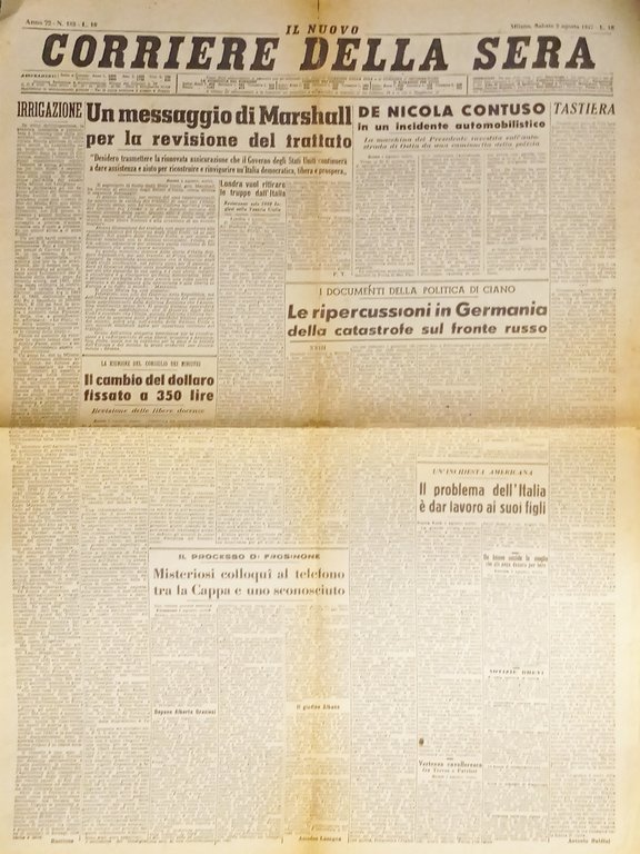 Corriere della Sera N.183 - 1947 Messaggio di Marshall per revisione di trattato