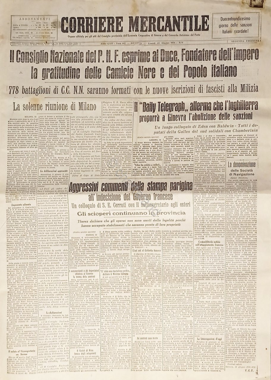 Corriere Mercantile N. 142 - 1936 Il Consiglio Nazionale P.N.F. esprime al Duce | Libri antichi e moderni |