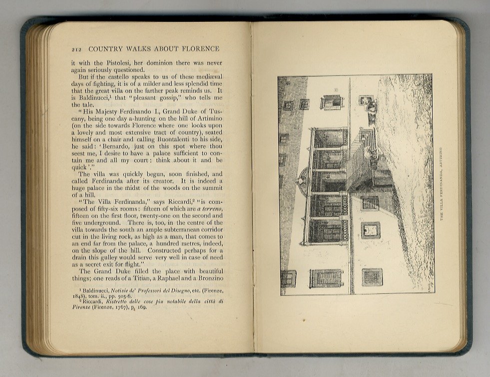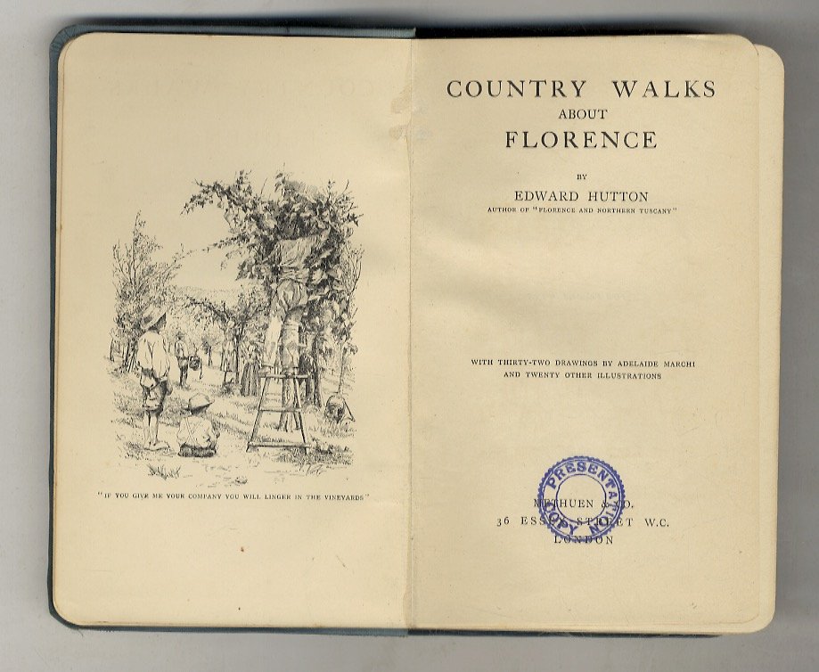 London, Methuen & Co., 1903, in-16, tela editoriale celeste con angoli dei piatti arrotondati, titolo oro al dorso ed al piatto anteriore, pp. XV, [1], 323, [1]. Cartina di Firenze e dintorni alle sguardie anteriori e 52 tavole in b.n. fra illustrazioni fotografiche e disegni di Adelaide Marchi: angoli suggestivi, scene di vita campestre e monumenti nei dintorni fiorentini. Prima edizione. Timbretto di "Presentation Copy" sul frontespizio. Ottime condizioni.