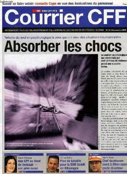 CFF. 2002. In-4 Carré. Broché. Bon état. Couv. convenable. Dos satisfaisant. Intérieur frais. 23 pages. Illustré de nombreuses photos en couleur. Texte sur plusieurs colonnes. Absorber les chocs (soutien psychologique). Sarah Vontobel. Otfried Köhn. Martin Wyss.