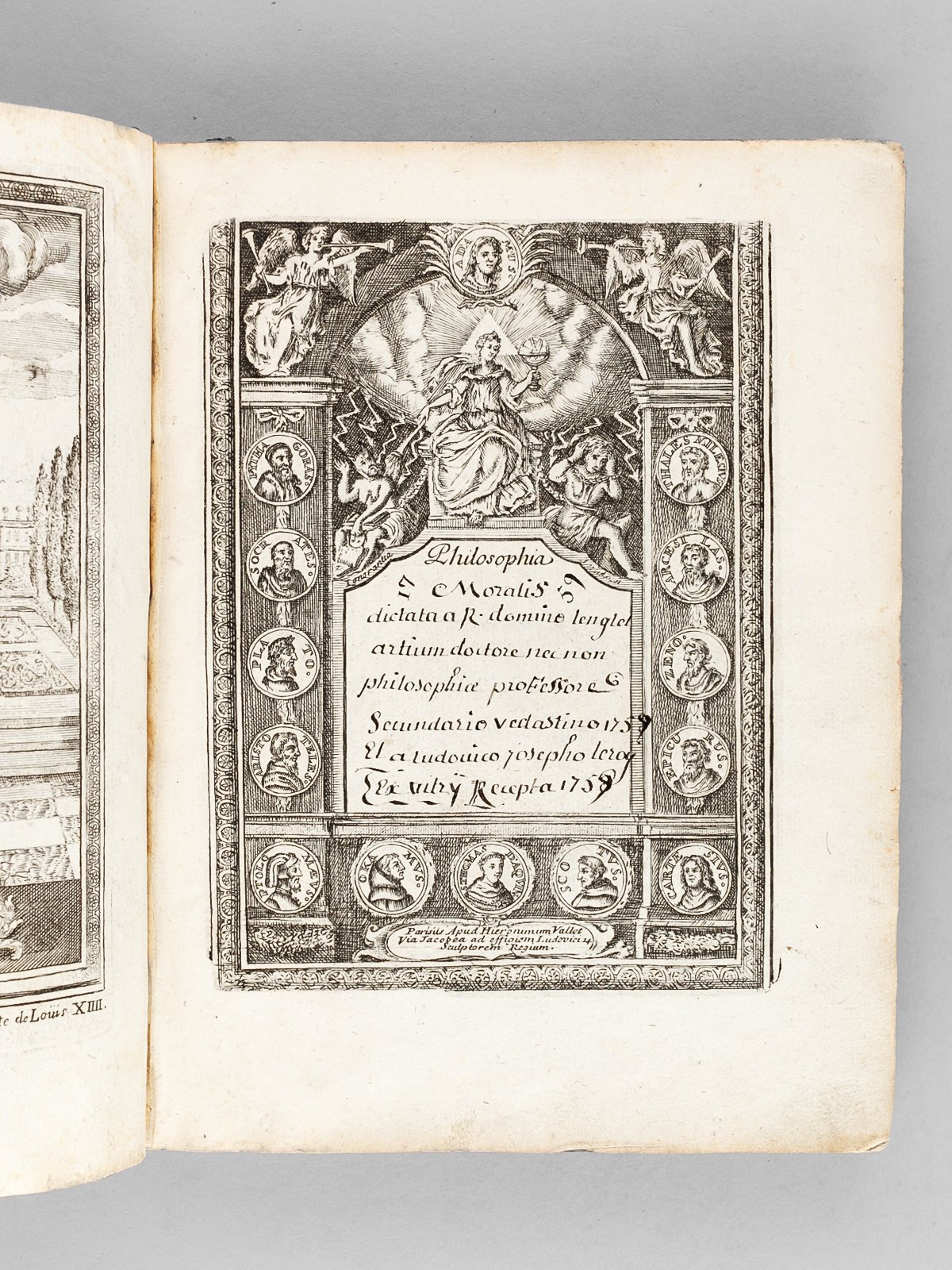 [ Cours de Philosophie Morale professé au Collège Saint-Vaast par Barthélémy Lenglet et copié par Louis-Joseph Leroy de Vitry - Manuscrit avec gravures - 1759 ] Ethica sive moralis dictata a R. ai R. Domino Bartholomeo Lenglet artium doctore necnon philosophiae Professore Secundario Sancti Vedasti (Duaci :) Et recepta a Ludovico Josepho Leroy ex Vitry | Libri antichi e moderni | Lenglet, Leroy De Vitry, Louis-Joseph