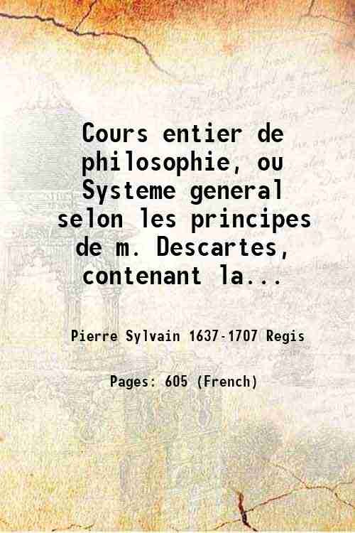 Cours entier de philosophie, ou Systeme general selon les principes de m. Descartes, contenant la logique, la metaphysique, la physique, et la morale. Par Pierre Silvain Regis . Tome premier troisieme 1691