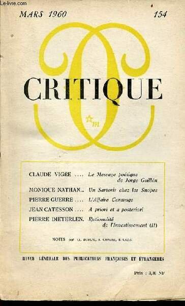 Critique revue générale des publications françaises et étrangères n°154 mars 1960 - Le message poétique de Jorge Guillen face à la tradition symboliste française par Claude Vigée - die struktur der modernen lyrik Hugo Friedrich - Jorge Guillen Lobgesang | Libri antichi e moderni | Collectif