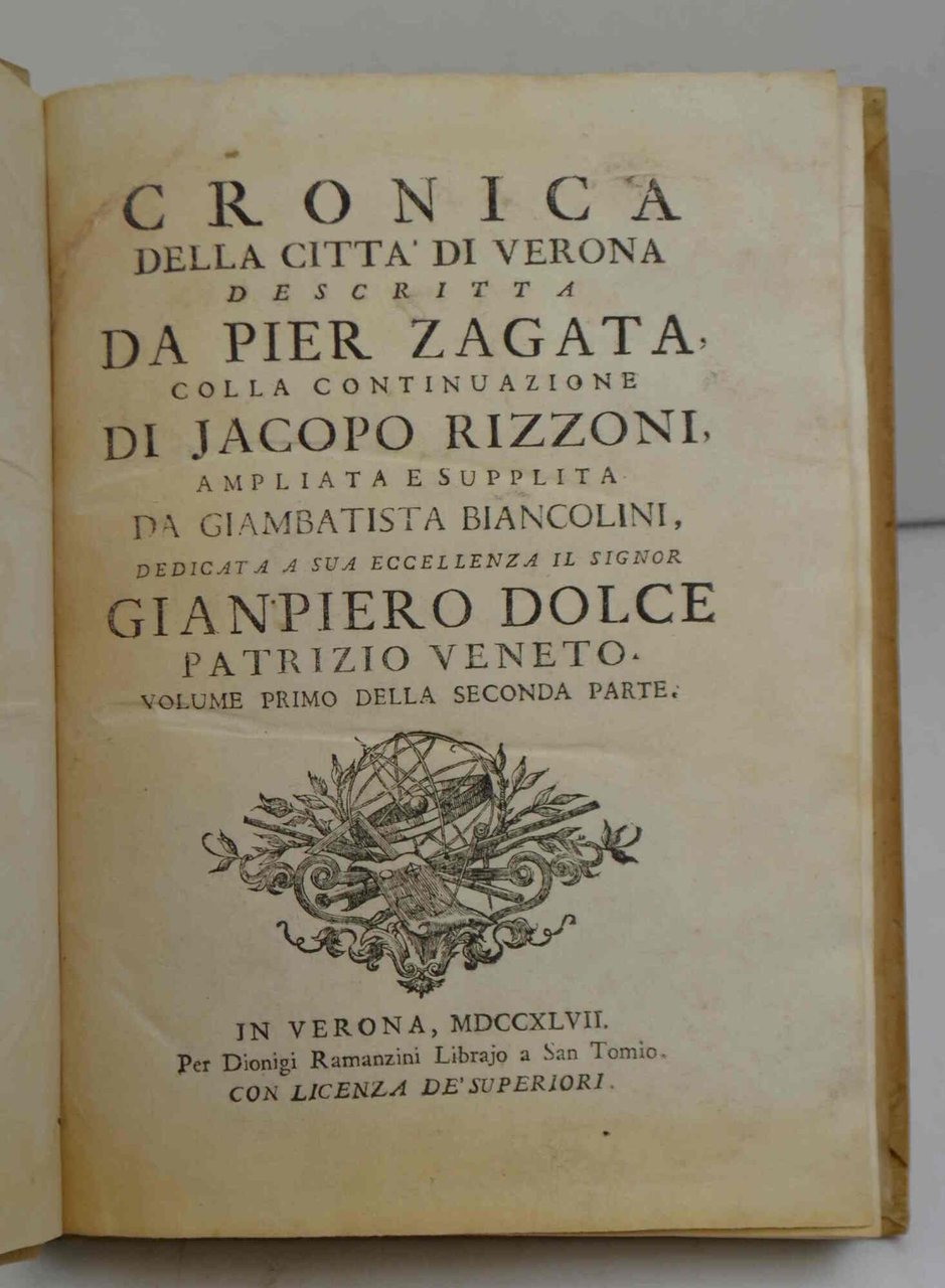 Cronica della Città di Verona descritta; ampliata, e supplita da Giambatista Biancolini. Annessovi un Trattato della Moneta Antica Veronese ec. Insieme con altre utili cose tratte dagli Statuti della Città medesima. Al Nobil Signor Dionisio Nichesola patrizio veronese. Volume primo della seconda parte. | Libri antichi e moderni | ZAGATA PIER.