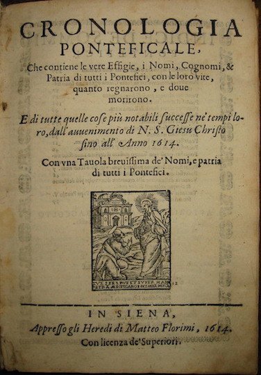 Cronologia Ponteficale, che contiene le vere Effigie, i Nomi, Cognomi, & Patria di tutti i Pontefici, con le loro vite, quanto regnarono, e dove morirono. E di tutte quelle cose più notabili successe ne’ tempi loro, dall’avvenimento di N.S. Giesù Christo sino all’Anno 1614. Con una Tavola brevissima de’ nomi, e patria di tutti i Pontefici | Libri antichi e moderni | Anonimo