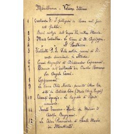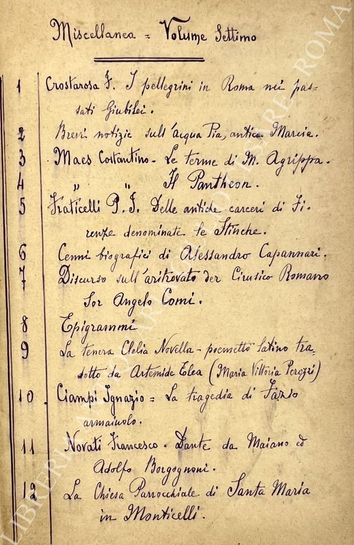 Crostarosa F. - I pellegrini in Roma nei passati giubilei. UNITO A: Brevi notizie sull'Acqua Pia (antica Marcia) ricondotta in Roma da una società romana l'anno 1870. UNITO A: Maes Costantino - Le Terme di Agrippa. Prime note archeologiche intorno ai recenti scavi. Il Pantheon ripristinato a mausoleo dei re d'Italia. UNITO A: Il Pantheon. Le espropriazioni e le demolizioni alle Terme di Agrippa. UNITO A: Delle antiche carceri di Firenze denominate le stinche or demolite e degli edifizj in quel luogo eretti l'anno 1834. UNITO A: Capannari Alessandro - Cenni biografici pubblicati a cura degli amici nell'anniversario della sua morte. UNITO A: A.B.R. - Discurso de padron Lisandro de la regola fatto a la gensola (I) co Peppe er duro, Cremente