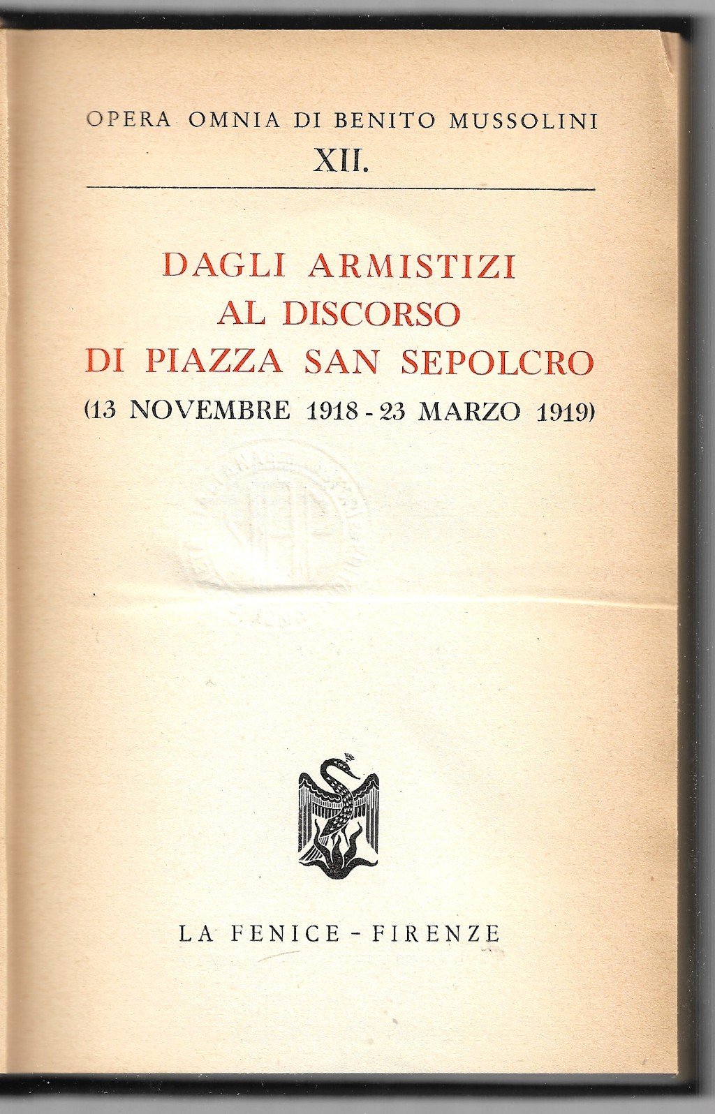 Libro vintage in-8°, cartonata di pagg 355, Firenze 1956. Storia, collana Opera Omnia di Benito Mussolini XII. Fregio a sbalzo in copertina, Tagli ingialliti, legatura allentata.