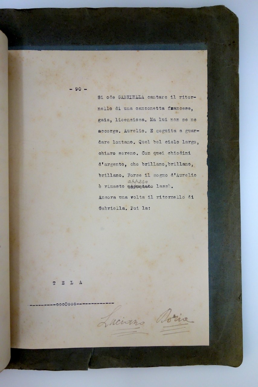 S. d. ma anni '20 - '30 del Novecento; opera teatrale dattiloscritta di pp. 90 (testo a un'unica facciata); numerose le note correttive e le sottolineature d'epoca per lo più a matita, molto probabilmente autografe dell'autore. Alla prima pagina dedica autografa dell'autore all'attrice Giannina Chiantoni, firmata con sigla L.D.; all'ultima pagina firma autografa dell'autore. Rilegatura d'epoca in cartoncino muto. Dimensioni: cm 32x25,5.