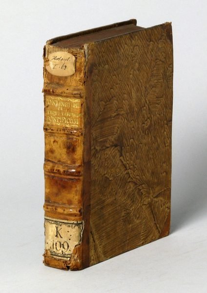 4to. 2 pts. (48), 135, (1), 44 pp. - (Bound with) II: The same. Defensio ecclesiae protestantium adversum duo pontificiorum argumentis. Ibid., 1654. 120 pp. - (Bound with) III: The same. Historia electionis Alexandri VII Papae. Ibid., 1657. 3 pts. 56, 23, (1), 3-117, (1) pp. With repeated woodcut devices. Marbled Austrian half calf (c. 1700) with giltstamped spine label. All edges sprinkled in red. Collection of three works of church history by Hermann Conring (1606-81), professor of medicine and philosophy at Helmstedt and one of the last great polymaths (cf. LThK III, 35). I: One of three printings in the year of the first edition; II und III: first editions. About bulls, conclaves, etc. - Somewhat browned, insignificant worming at beginning and end. Spine-ends damaged. From the library of the Vienna Discalced Augustinians with their ms. shelfmarks. - I: VD 17, 12:116684D. - II: VD 17, 12:115494V. - III: VD 17, 3:008223P.