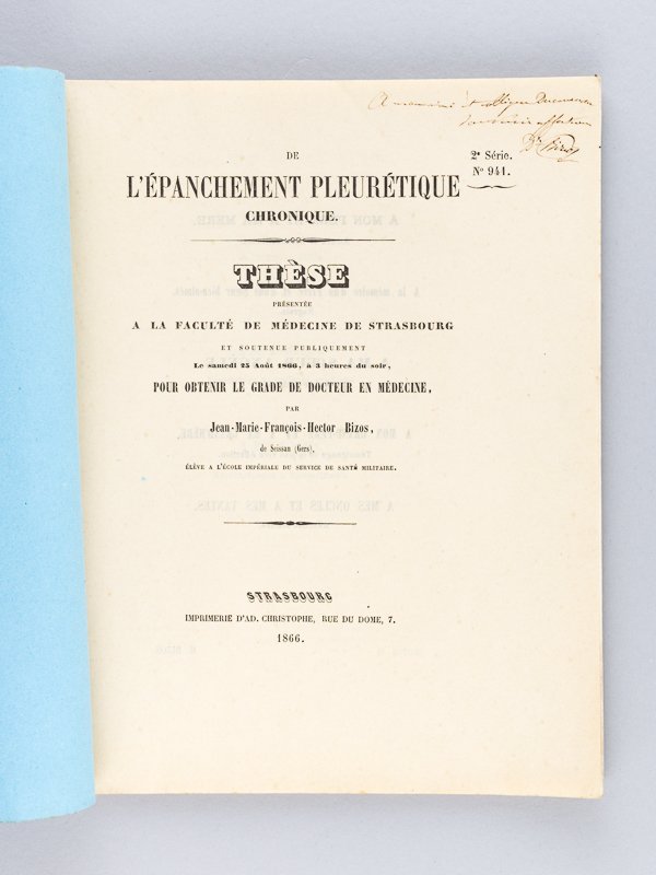 De l'Epanchement pleurétique chronique. Thèse présentée à la Faculté de Médecine de Strasbourg, soutenue le 25 août 1866 [ Edition originale - Livre dédicacé par l'auteur ] | Libri antichi e moderni | Bizos, Jean-Marie-François-Hector De Seissan (Gers), Elève De L', Ecole Du Service De Santé Militaire