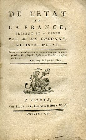 In-8° (205x135mm), pp. XVI, 356, brossura muta coeva di colore rosa. Vignetta incisa al titolo. Bruniture lievi. Buon esemplare in barbe e a fogli chiusi. Edizione contemporanea all'originale. Calonne (Douai, 1734-Parigi, 1802) fu Ministro delle Finanze di Luigi XVI dal 1783 al 1787. Gli sforzi di Calonne per risolvere la crisi finanziaria nazionale e di porre rimedio al pesante deficit non incontrarono fortuna e suscitarono lo sfavore sia dei ceti aristocratici e della corte che del popolo, valendogli lo sferzante soprannome di 'Monsieur Deficit'. Destituito ed esiliato dal Re per il rapido aggravarsi della situazione economica il 18 aprile 1787, fuggì in Inghilterra allo scoppio della Rivoluzione e fece ritorno in Francia soltanto nell'anno della morte. Il presente scritto venne composto da Calonne nel suo esilio inglese, l'anno stesso dell'abolizione delle 'lettres de cachet', della vendita dei beni ecclesiastici e della promulgazione dellla Costituzione Civile del clero. Calonne polemizza vivacemente con l'Assemblea Nazionale e con la Rivoluzione Francese in genere riguardo all'andamento delle finanze pubbliche di Francia e difende, retrospettivamente, il proprio operato. Bersaglio preminente sono il grosso deficit di bilancio e il vertiginoso aumento del debito pubblico francese dal 1787 in poi. Lo scritto di Calonne suscitò numerose e sdegnate controrepliche da parte dei fautori della Rivoluzione. L'edizione originale, dello stesso mese ma constante di 440 pagine, era stata pubblicata a Londra da Spilsbury; nello stesso anno uscirono numerose edizioni, con paginazione differente. Cfr. Kress, B1799 e B1800. Stourm, p. 186. Masui, I-421.Goldsmiths', 14081. Martin & Walter, I, 5820. Einaudi, 796.