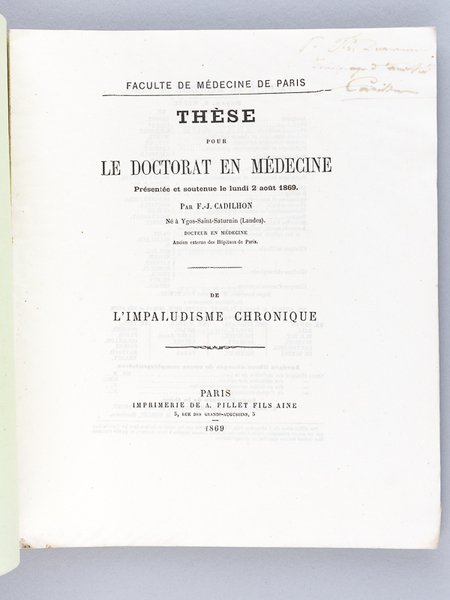 De l'Impaludisme chronique. Thèse pour le Doctorat en médecine présentée et soutenue le lundi 2 août 1869 [ Edition originale - Livre dédicacé par l'auteur ] | Libri antichi e moderni | Cadilhon, F.-J., Né À Ygos-Saint-Saturnin (Landes)