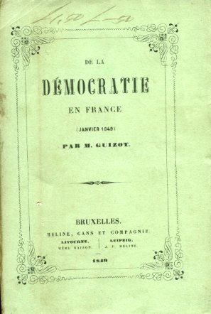 In-16°, pp. (2), 149, (2), brossura editoriale verde con titolo entro bordura con fregi ornamentali accantonati. In barbe, in bello stato, con minimi restauri al dorso. Ex-libris Cazzamini Mussi; si tratta di Francesco Cazzamini-Mussi (MIlano, 1888-ivi, 1954), giornalista e scrittore che compose tra l'altro, a quattro mani con Marino Moretti, il poema drammatico 'Leonardo da Vinci'. Edizione di Bruxelles, contemporanea all'originale di Parigi, di questo scritto pubblicistico di Guizot sullo stato della democrazia inFrancia immediatamente dopo i moti rivoluzionari del 1848; lo storico espone il proprio punto di vista sulla monarchia costituzionale così come sul repubblicanesimo, oggetto di un severo giudizio. I mali della Francia derivavano a giudizio di Guizot da una male intesa idea di democrazia come egualitarismo e livellamento tra le classi; ferma restando l'esigenza di un'eguaglianza giuridica tra i cittadino, debbono rimanere però dei punti fermi le ineguaglianze dei poteri politici e delle classi, che, se annullate, condurrebbero alla tirannide assolutistica o all'anarchia. L'appello di Guizot si indirizza all'illuminato conservatorismo delle élites e guarda come proprio modello saliente al sistema costituzionale britannico. Francois Pierre Guillaume Guizot (Nimes, 1787-Val Richer, Lisieux, Calvados, 1874), tra i masssimi storici e statisti francesi del secolo XIX, autore di molte celebri opere sulle rivoluzioni di Francia e Inghilterra, fu in politica un monarchico costituzionale su posizioni non lontane da quelle del suo amico Royer Collard. Ricoprì il Ministero dell'Istruzione sotto Luigi Filippo, introducendo un nuovo sistema per l'educazione primaria, e, nel 1847, la carica di Primo Ministro. Einaudi, 2810. Stammhammer, I, p.99. Non in Goldsmiths. Cfr. Mario Bonfantini in Diz. Bompiani d. Opere, II, 599.