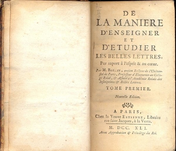 De la maniere d'enseigner et d'etudier les belles lettres, par raport à l'esprit & au coeur. Nouvelle edition. | Libri antichi e moderni | Rollin M.