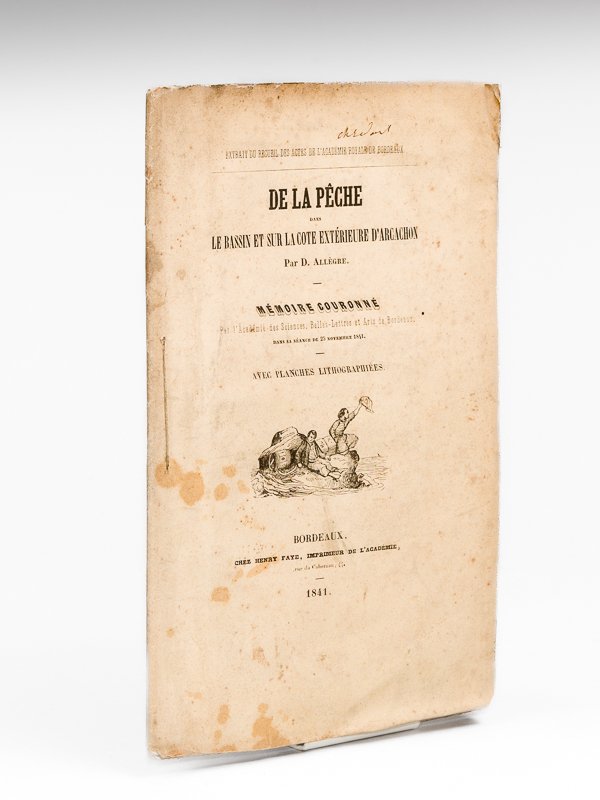 Extrait du Recueil des Actes de l'Académie Royale de Bordeaux, Mémoire couronné par l'Académie des Sciences, Belles-Lettres et Arts de Bordeaux dans sa séance du 25 novembre 1841, avec planches lithographiées, 1 brochure in-8 br., Chez Henry Faye, Bordeaux, 1841, 31 pp. avec 2 planches lithographiées dépliantes Très rare exemplaire du tiré-à-part, complet des 2 planches dépliantes : "Pêche au filet trémail par les Chaloupes d'Arcachon" et "Pêche au Chalut par les Cutters de Turbay". Etat très satisfaisant (couv. frottée, petite tache sur une planche, bon état par ailleurs) pour cette étude remarquable.